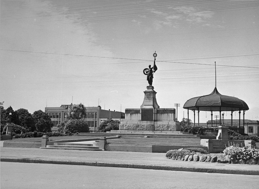 The Palmerston North War Memorial which was unveiled in 1925. Note the Band Rotunda and Municipal Library directly behind the Memorial.