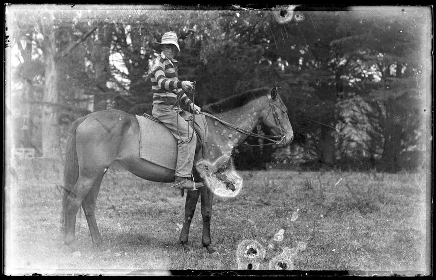 This photograph was created by William James Young in the early 20th century. A large variety of subjects are depicted in the collection, but family, rural life and travel are the most prominent themes. The exact location of the photographs in the Young Collection is unknown, but W J Young lived on a farm in Mt Stewart, Rangitikei, and some of the photographs include his house. The Young family were apparently avid travellers and photographs later in the collection feature scenes from Rotorua, Auckland, Whanganui, as well as other unidentified locations. The portraits are all unidentified, but are presumably of members of the Young family. The photographers parents were George Henry (b 1833) and Jane McDowell (b 1842, d 1916). They came to New Zealand in 1877. The same year, they bought the home farm on Mt Stewart and called it Kilrudden after Kilrudden House, the home of the McDowell family in Ireland. The couple had four children: Ann (b 1873), Margaret (b 1876), John (b 1878) and William James (b 1880). William James married Mary Elizabeth Thompson and they had four children: Doris (b 1914, d 1989), George (b 1916, d 1991), Royden McDowell (b 1925, d 1992) and Noel William (b 1927, d 2013).