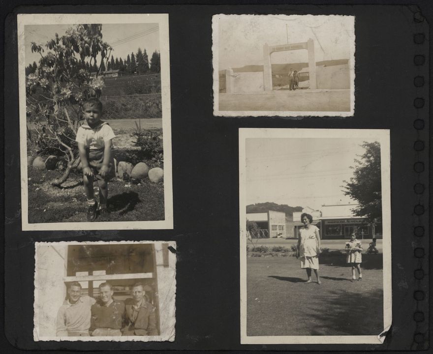 A family photograph album of unknown origin. The images appear to span the 1930s-1970s and includes Foxton School class photograph (1970), unidentified rugby team, Te Hauke war memorial, soldiers during World War Two, and portraits of unidentified groups and individuals. A newspaper clipping mentions the marriage of Daphne Puahu (nee Toawairere) and David Puahu in Wanganui.