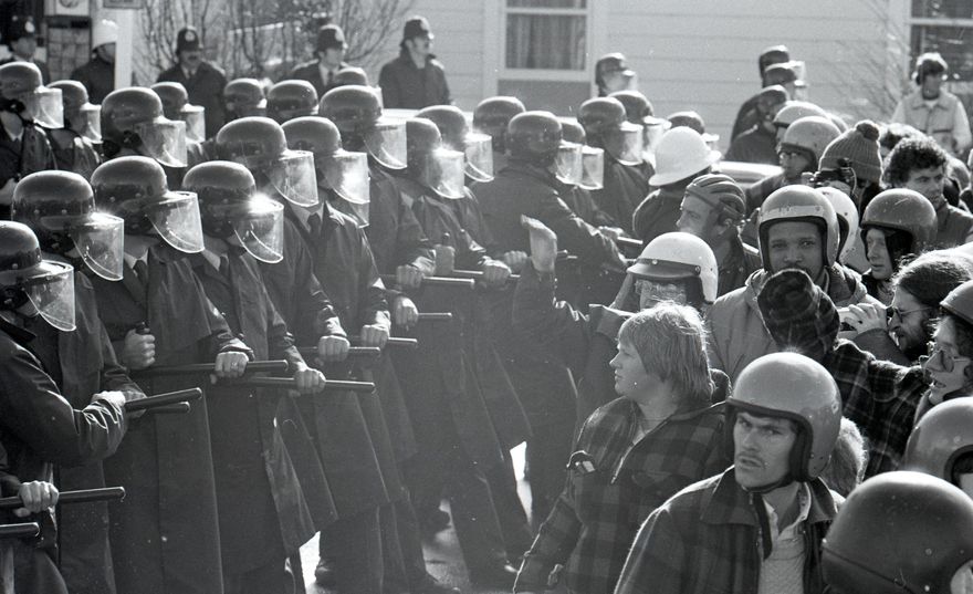 This image was taken (but not used) for a story that ran in The Manawatu Evening Standard on 01 August 1981. The Standard reported that the protesters stood ‘eyeball to eyeball’ with Police in riot gear for 24 minutes during an unplanned standoff on the intersection of David and Cuba Streets.