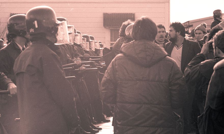 This image was taken (but not used) for a story that ran in The Manawatu Evening Standard on 01 August 1981. The Standard reported that the protesters stood ‘eyeball to eyeball’ with Police in riot gear for 24 minutes during an unplanned standoff on the intersection of David and Cuba Streets.