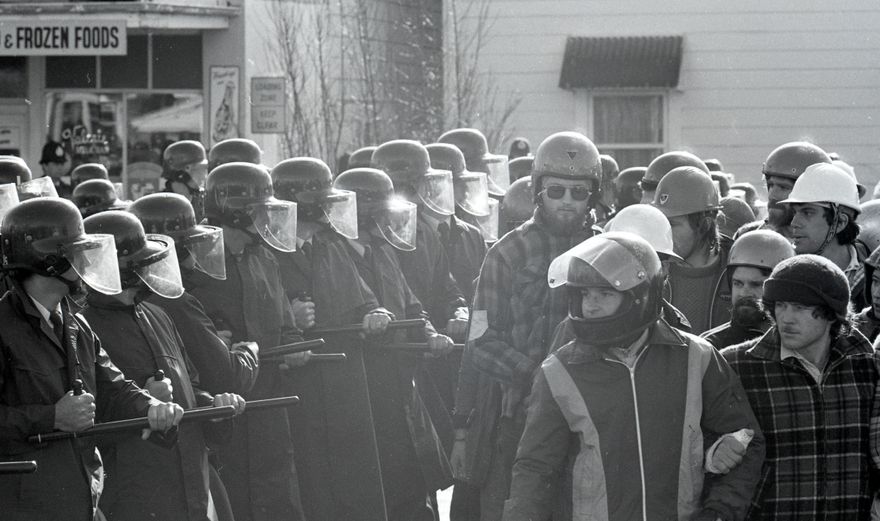 This image was taken (but not used) for a story that ran in The Manawatu Evening Standard on 01 August 1981. The Standard reported that the protesters stood ‘eyeball to eyeball’ with Police in riot gear for 24 minutes during an unplanned standoff on the intersection of David and Cuba Streets.