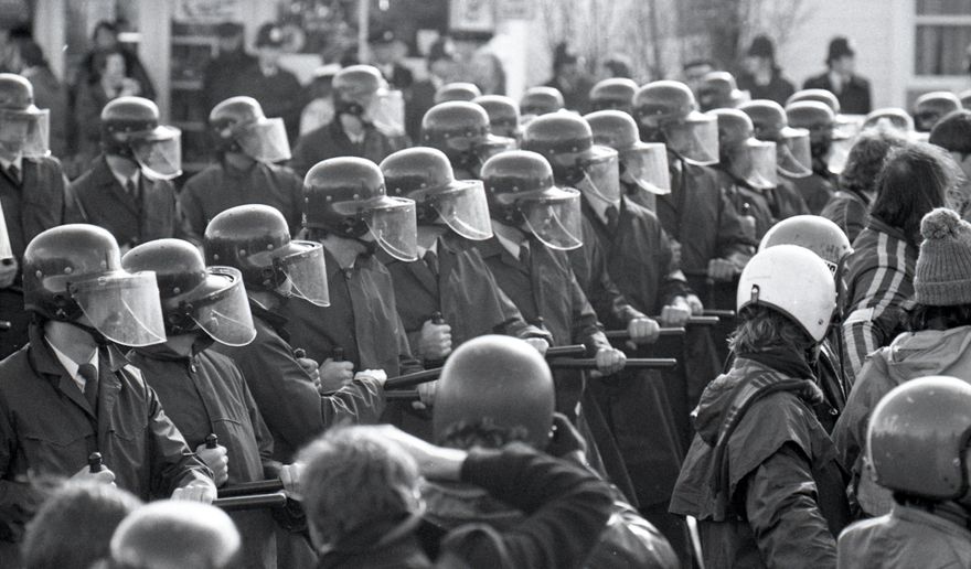 This image was taken (but not used) for a story that ran in The Manawatu Evening Standard on 01 August 1981. The Standard reported that the protesters stood ‘eyeball to eyeball’ with Police in riot gear for 24 minutes during an unplanned standoff on the intersection of David and Cuba Streets.
