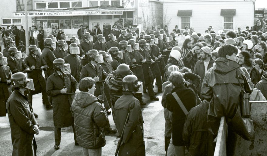 This image was taken (but not used) for a story that ran in The Manawatu Evening Standard on 01 August 1981. The Standard reported that the protesters stood ‘eyeball to eyeball’ with Police in riot gear for 24 minutes during an unplanned standoff on the intersection of David and Cuba Streets.