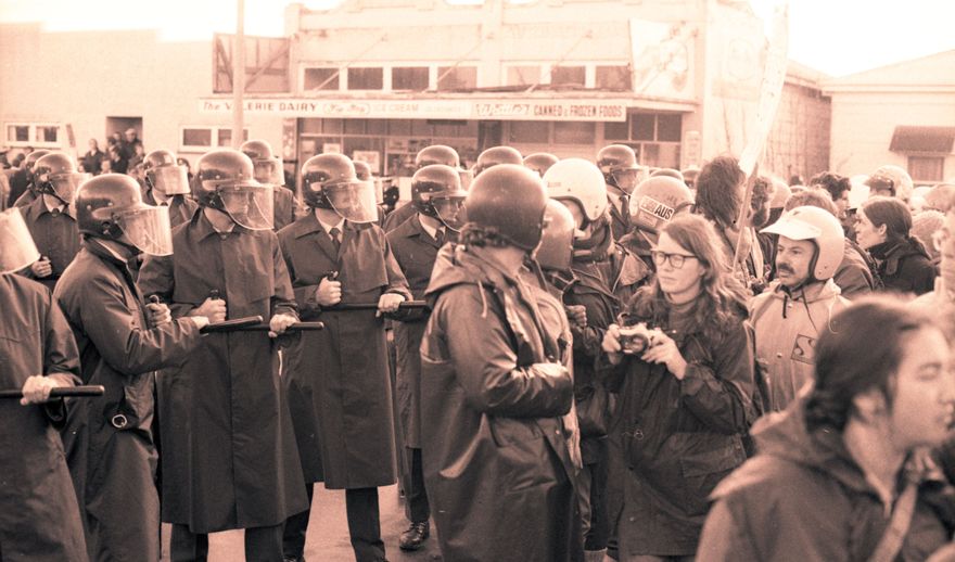 This image was taken (but not used) for a story that ran in The Manawatu Evening Standard on 01 August 1981. The Standard reported that the protesters stood ‘eyeball to eyeball’ with Police in riot gear for 24 minutes during an unplanned standoff on the intersection of David and Cuba Streets.