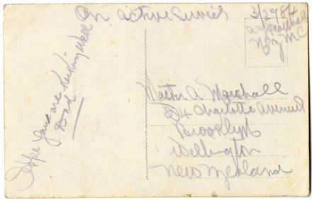 Private Alfred Joseph (Joe) Marshall served with the New Zealand Medical Corps including on board the Hospital Ship Maheno. This postcard depicts the Royal Palace, Malta. The inscription reads: "On Active Service 3/2784
