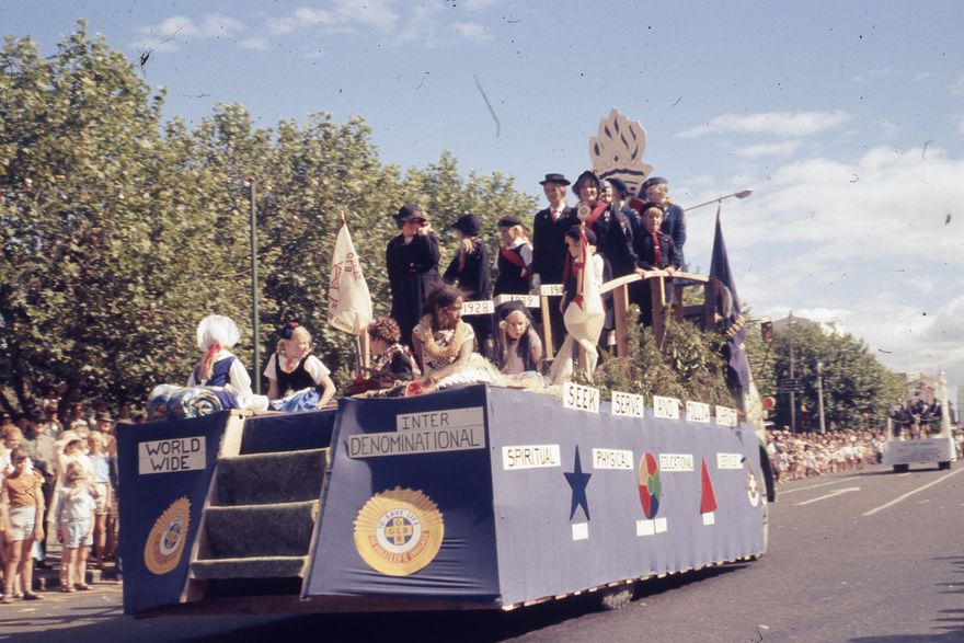 The Girls' Brigade float in the Centennial Parade. 92 floats took part at the Palmerston North City Centennial celebrations of 1971. Approx. 10,000 people were present at the event to celebrate 100 years of Palmerston North.