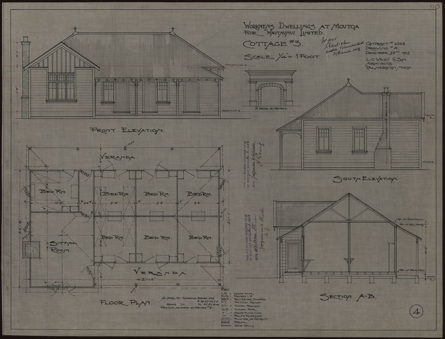 These plans for facilities at the Moutoa Flaxmill were designed by L. G. West for Whitaunui Ltd. They include plans for additions to the dining room, workmen's dwellings, stables and a water tankstand. The Danish-born architect Ludolph Georg West (1846-1919) established an architectural practice in Palmerston North in about 1880. In 1912 he formed a partnership with his son, Ernest Vilhem West, who continued the business after his father's death.