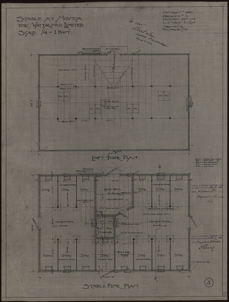 These plans for facilities at the Moutoa Flaxmill were designed by L. G. West for Whitaunui Ltd. They include plans for additions to the dining room, workmen's dwellings, stables and a water tankstand. The Danish-born architect Ludolph Georg West (1846-1919) established an architectural practice in Palmerston North in about 1880. In 1912 he formed a partnership with his son, Ernest Vilhem West, who continued the business after his father's death.