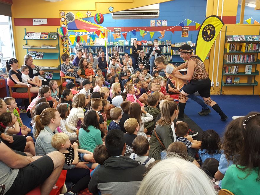 - Strong Man Stan (Rowan Dawson) with a volunteer performing his circus act to the Awapuni Library audience as part of the 2019/2020 Summer Reading Programme.