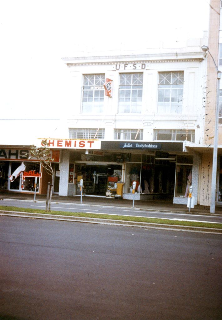 A chemist and clothing store in the UFSD Building, between Rangitikei Street and Coleman Mall.