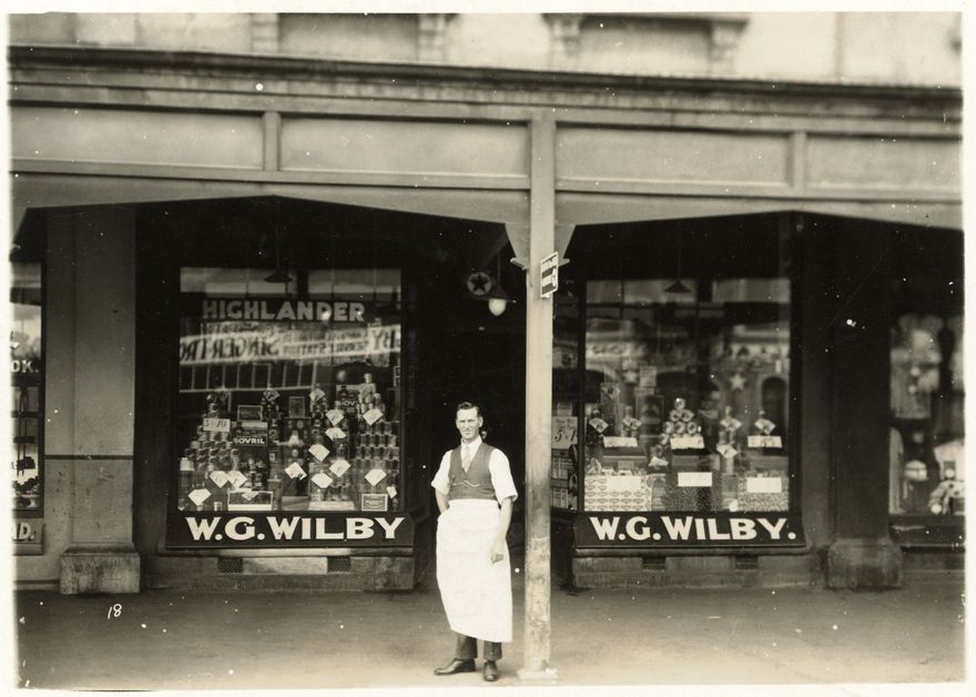 Man standing outside William Godson Wilby's shop in Cuba Street, Palmerston North, near the corner of Lombard Street. The store appears to sell groceries and the man is probably William Wilby. William Wilby gave up the shop in the 1930s.
