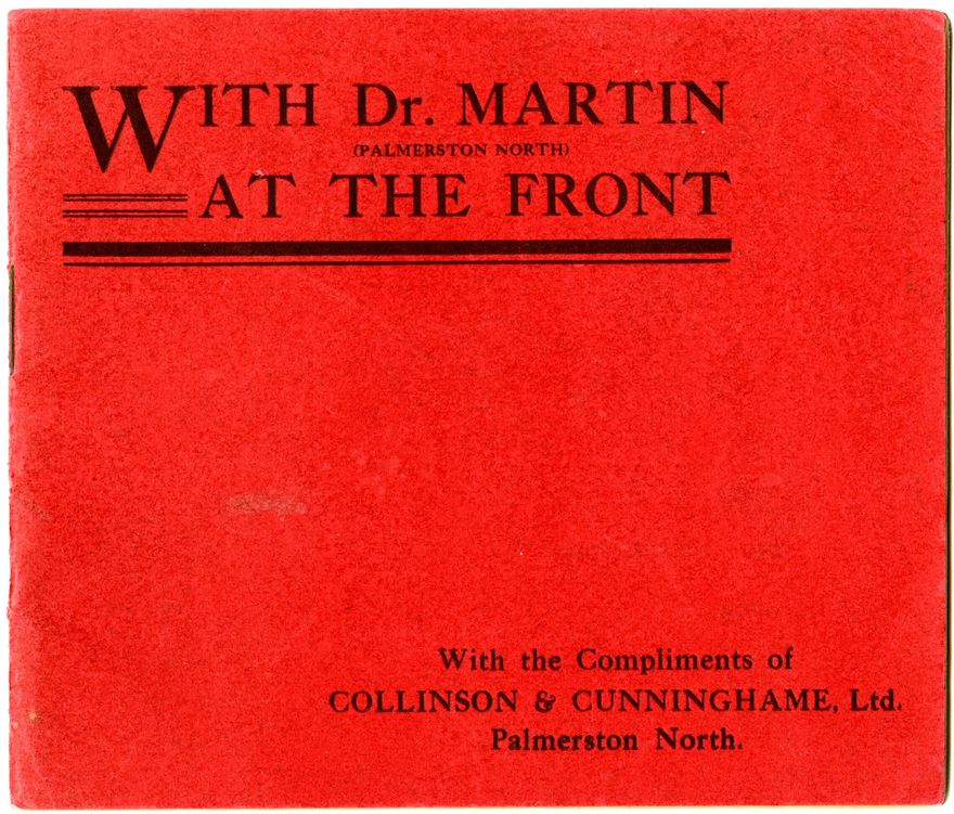 The front of this booklet reads, "With Dr Martin (Palmerston North) at the Front - with the Compliments of Collinson & Cunninghame, Ltd. Palmerston North". Dr Arthur Anderson Martin served in the South African Field Force 1901, British Expeditionary Force and as a surgeon in World War One, when he died of wounds at the Somme, 17 September 1916. He was a Senior Surgeon at Palmerston North Hospital and the author of 'Surgeon in Khaki'.