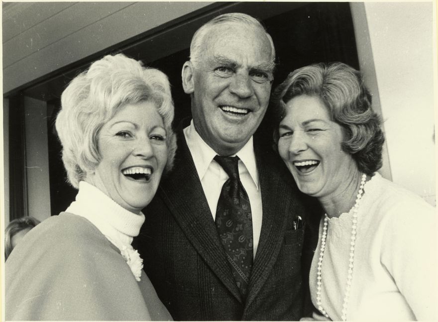 Arnold Matthew Peter Hall became assistant Town Clerk of the Palmerston North City Council in 1945. He later succeeded Mr J R Hardie as Town Clerk in 1954. This photograph is on the occasion of his retirement in 1974. He died January 1983. Article in Manawatu Standard 25 January 1974.