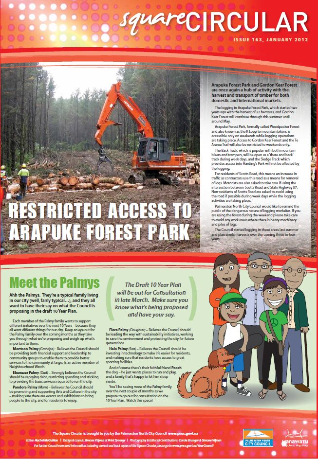 The Square Circular was Palmerston North City Council's monthly community publication, informing Palmerstonians of PNCC initiatives, activites, and events. This month's issue includes: Forestry; 10 Year Plan; Volunteer Awards; Social responsibility; Fire Alarms; Road works; Building consent; Alcohol safety; Sustainability; Cycling; Civil Defence; Parks.