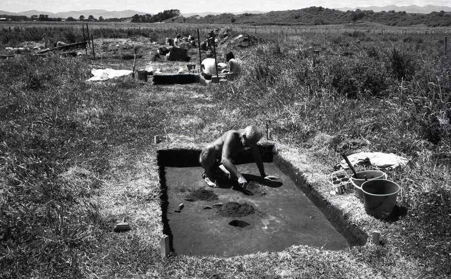 Wellington archaeologist Mr Bruce McFadgen led a team of 10 volunteers and members of the Wellington archaeological society in excavating a site at Foxton Beach. Excavation at the site had been carried on since 1963 at intervals. This image was taken in January 1970.