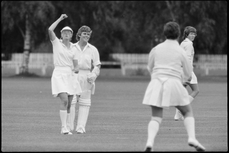 This image was taken (but not used) by the Evening Standard on 19th of January 1982. It depicts the Manawatū women’s cricket team taking on the Australian women’s team in a limited over warm-up match for the Hansell's Vita Fresh Women's World Cup 1981/1982. The match was held at Ongley Park in Palmerston North. The Australian team won by 202 runs. The match report ‘Aussies too polished in all facets’ was written by Ford Watson and published the next day: