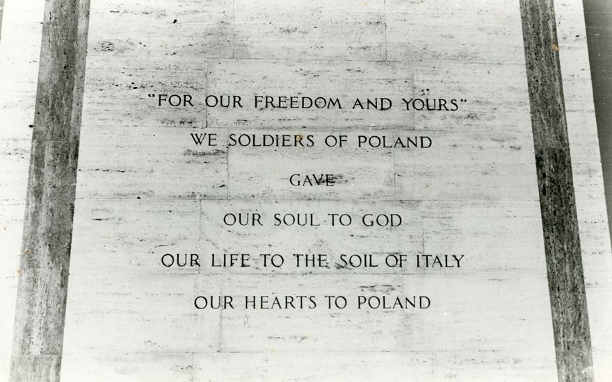 Image of inscription on Polish memorial at Monte Cassino, Italy. Reads, " For our Freedom and yours we soldiers of Poland gave our soul to God, our life to the soil of Italy, our Hearts to Poland". The Polish Army League, founded in Palmerston North, developed a relationship with Polish soldiers through befriending the soldiers. They corresponded with them and sent parcels. The Polish soldiers reciprocated with gifts, to acknowledge their appreciation of the friendship, and New Zealand's response to the welfare of Polish children.