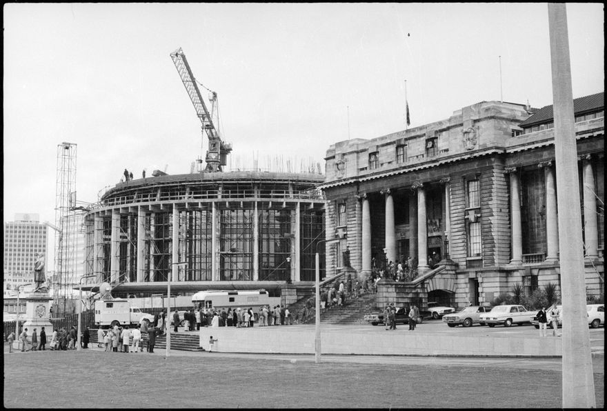 "Hammers still pound and a crane rumbles on the Beehive construction, next door. But conversation among the workers, the scurrying housewives and the more dapperly dressed reverts to the Hill and the question. Who will fill the sudden vacuum left by the 29th Prime Minister?"