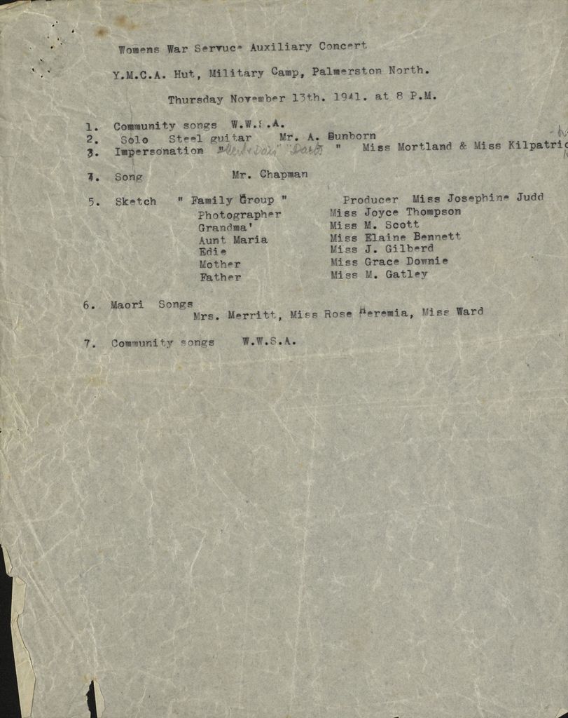 Concert to be held at the Y.M.C.A. Hut, Military Camp, Palmerston North on Thursday November 13th. 1941. at 8pm.