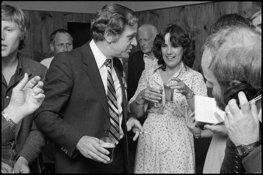 This image was taken by the Evening Standard on Saturday 28th of November 1981 but was not published. It depicts Social Credit leader Bruce Beetham celebrating his successful campaign for the Rangitikei parliamentary seat, with his wife Beverley and various supporters at the Victory Hall in Marton.