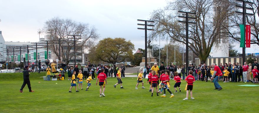 This early morning game of ‘Rippa Rugby’ in Te Marae o Hine – The Square was played by local school children who donned the colours of Romania and Georgia. These countries played their Rugby World Cup 2011 game at Palmerston North’s Arena later that night. The game attracted media interest, with TV One news reporters Tamati Coffey and Petra Bagust in attendance.
