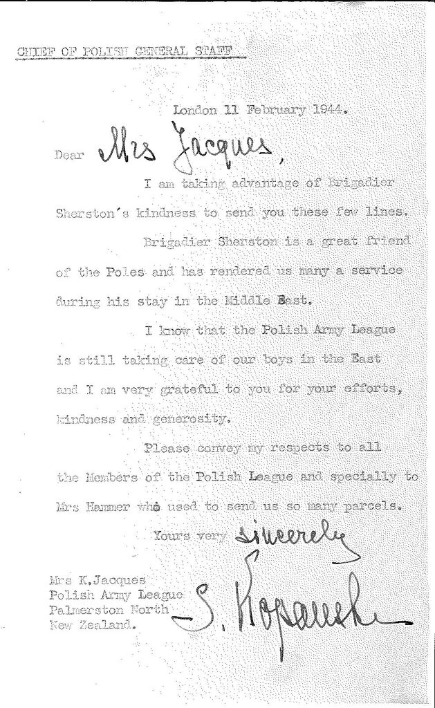 Letter from S. Kopanski, Chief of Polish General Staff to the Polish Army League, thanking them for their work. He also mentions Brigadier Sherston. The Polish Army League, founded in Palmerston North in WWII, corresponded with and sent parcels to Polish soldiers who served with the allies in World War Two.