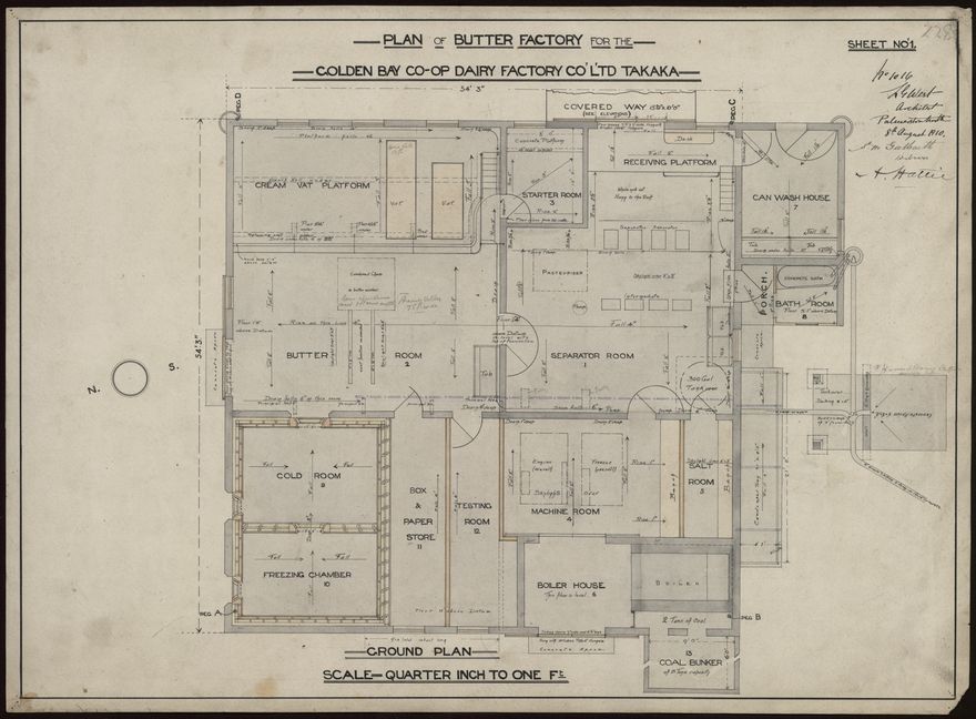 These plans for a butter factory was designed by L. G. West for the Golden Bay Co-operative Dairy Company Limited. The Danish-born architect Ludolph Georg West (1846-1919) established an architectural practice in Palmerston North in about 1880. In 1912 he formed a partnership with his son, Ernest Vilhem West, who continued the business after his father's death.