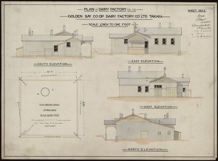 These plans for a butter factory was designed by L. G. West for the Golden Bay Co-operative Dairy Company Limited. The Danish-born architect Ludolph Georg West (1846-1919) established an architectural practice in Palmerston North in about 1880. In 1912 he formed a partnership with his son, Ernest Vilhem West, who continued the business after his father's death.