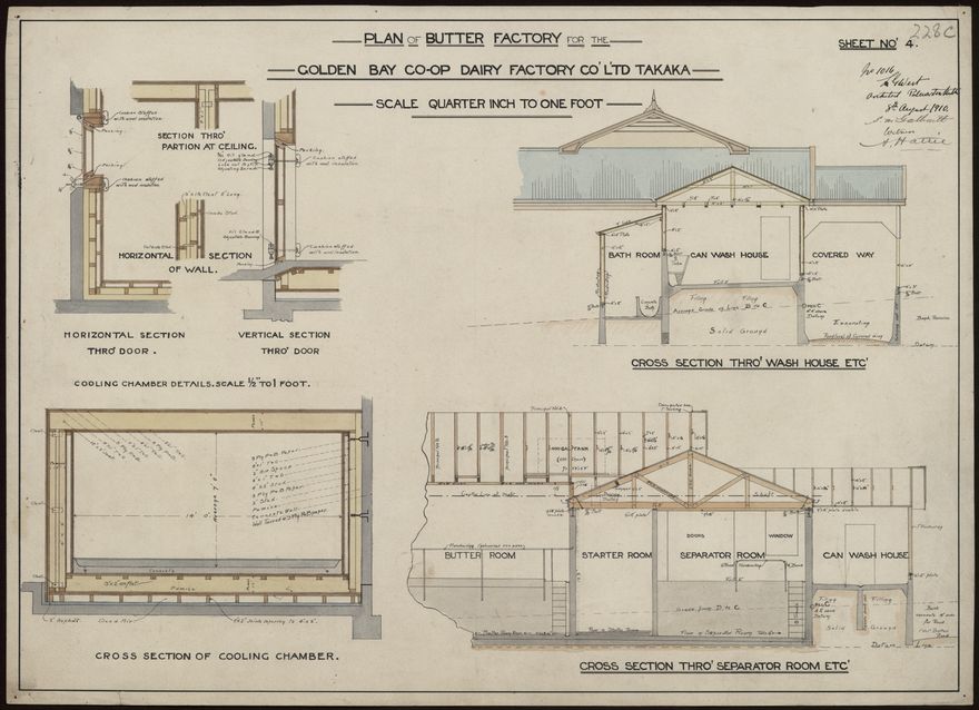These plans for a butter factory was designed by L. G. West for the Golden Bay Co-operative Dairy Company Limited. The Danish-born architect Ludolph Georg West (1846-1919) established an architectural practice in Palmerston North in about 1880. In 1912 he formed a partnership with his son, Ernest Vilhem West, who continued the business after his father's death.