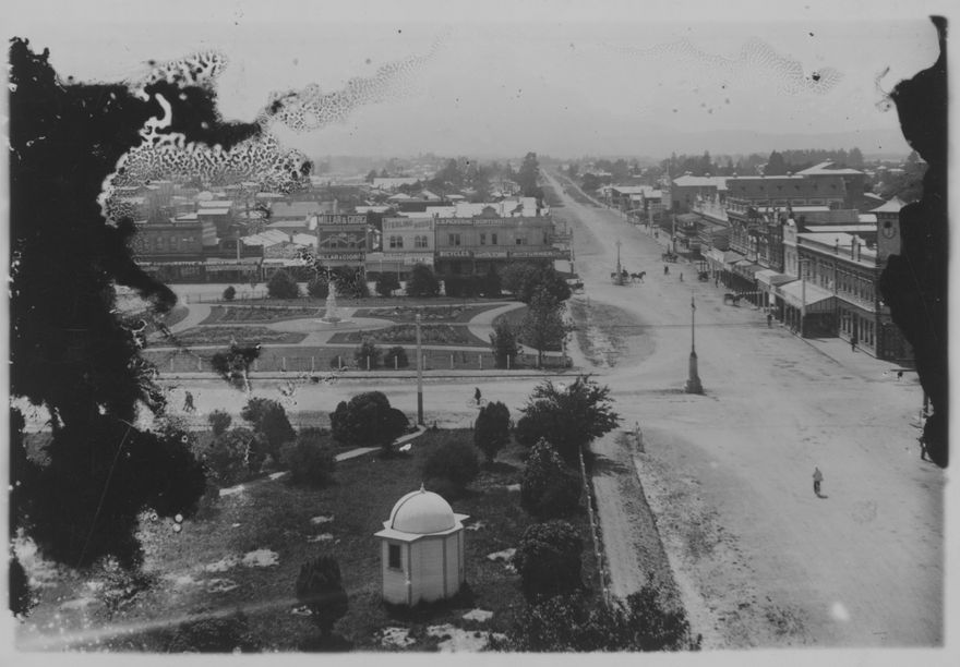 This photograph could have possibly have been taken from the Grand Hotel, which stands on the corner of The Square and Church Street West. The statue of Te Peeti Te Awe Awe was erected in 19070 and the little building in the foreground is an observatory. The buildings on the Square, from left, are: United Farmers Cooperative Society (1895-1908), now occupied by the Square Centre; Millar and Giorgi (built in 1902); G S Pickering (bicycle shop); Bunting Photographs Studio; Alex Turner (wallpaper shop, once Maple Furniture now a row of retail stores). Buildings on Church Street, from right: The Occidental Hotel (on the corner of Fitzherbert Avenue and the Square), which was built in about 1887 and destroyed by fire in 1891. A second hotel was built on the site but in 1927 was also destroyed by fire; W F Durrand's Drapery (1907-1915); The Club Hotel (next high building); The Opera House is the building further back on the right with a flag pole (built 1905); C Dahl, dairy machine merchants, was established in Palmerston North in 1881.