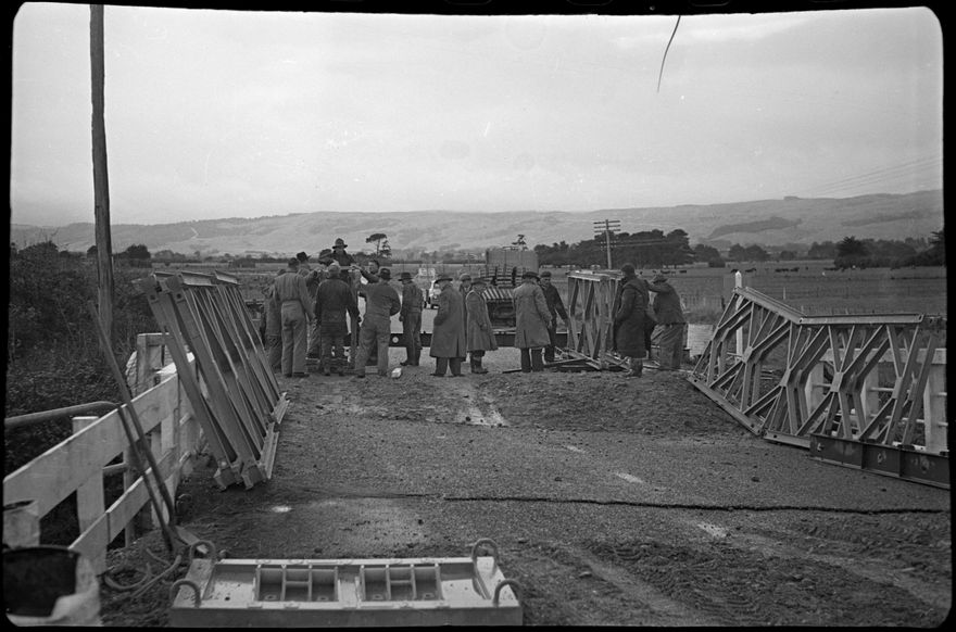 Captions read:“Watched by local residents a workman removes the thin, deceptive layer of tarseal on the approach to the bridge at Whakarongo, near Stoney Creek Road, after heavy rain had swollen the stream and caused a washout.”