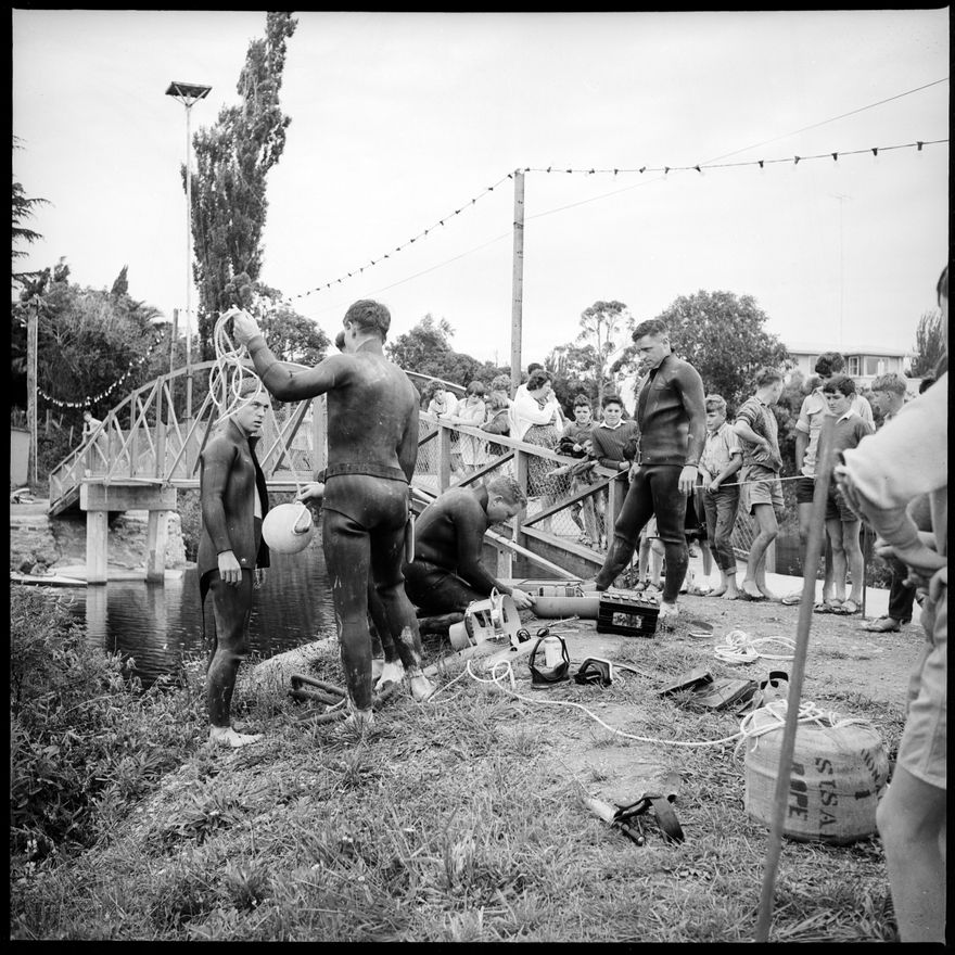 This image was not taken published in The Manawatu Evening Standard, taken on 18 January, 1964. [Royal New Zealand divers test equipment at Centennial Lake for the Palmerston North Carnival of the Lake." See also: 2017N_2017-20_018312, 2017N_2017-20_018313, 2017N_2017-20_018314. 2017N_2017-20_018310 was published on 18 January, 1964.