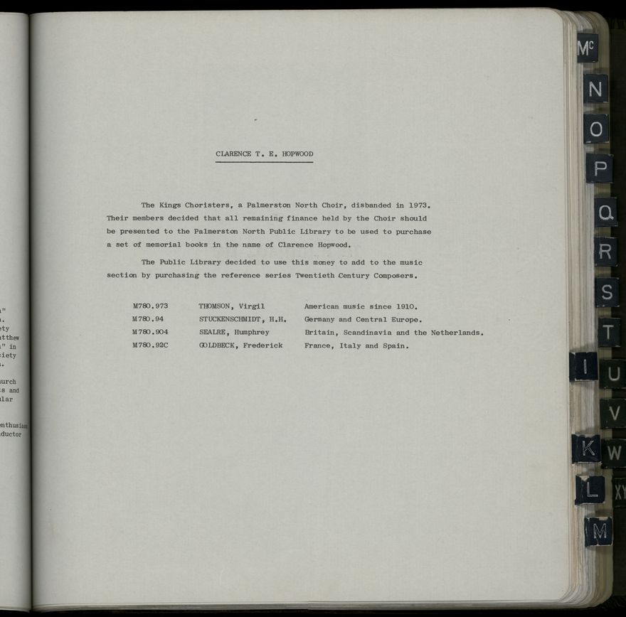 Memorial book with details of book donations to the Palmerston North Public Library and also memorial tributes to various Palmerston North residents, e.g. Audrey Gwendolen Adcock, Minnie Thomas, Charlotte Warburton and more.