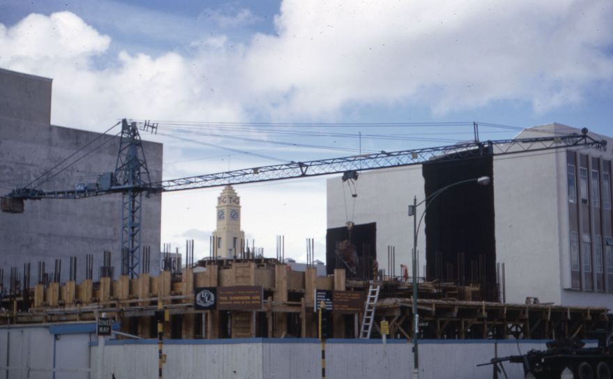 Picture of the building of the Commercial Union Building, situated on the corner of Rangitikei and King Streets, which was completed in March 1973. The T&G clock tower can be seen behind the construction site. The side of the Bank of New South Wales building was exposed during the construction process.