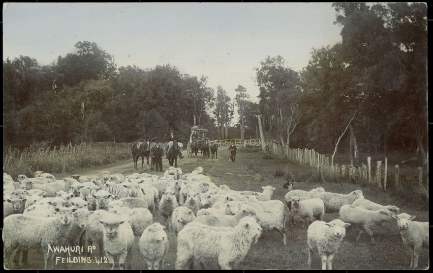 A flock of sheep block Awahuri Road. Behind them gentleman on horseback, a bicyclist and a coach wait to pass. Taken around the Kitchener Park area.