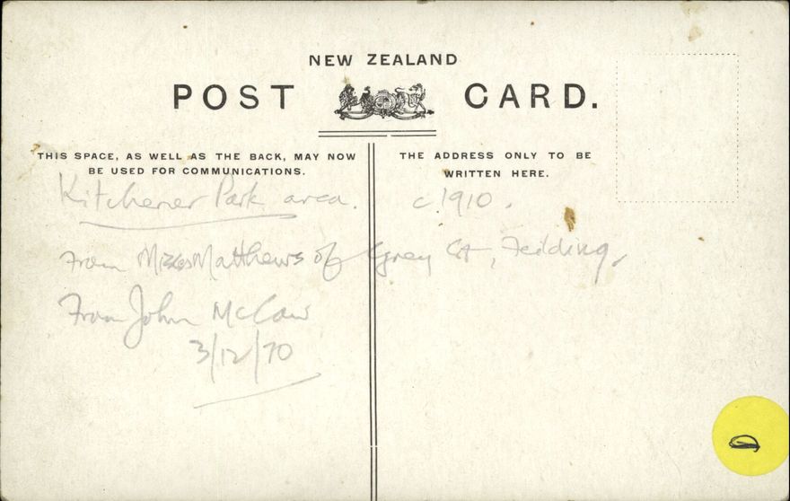 A flock of sheep block Awahuri Road. Behind them gentleman on horseback, a bicyclist and a coach wait to pass. Taken around the Kitchener Park area.