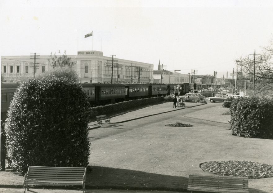 One of the last, special, excursion trains to go through The Square in either March or June 1964. The Milson deviation had been opened in 1960 and the new Railway Station in 1963, removing the need for trains to travel through the centre of the city and down Main Street. The railway tracks were then removed. The train full of passengers is shown here going past the Post Office, on the corner of Main Street, and entering The Square.