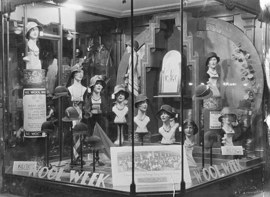 A display of hats during Wool Week, encouraging the use and wearing of New Zealand Wool. The new Rosco building, built 1927-1928 featured two sets of display windows, one in front and one behind, with a foyer in between.