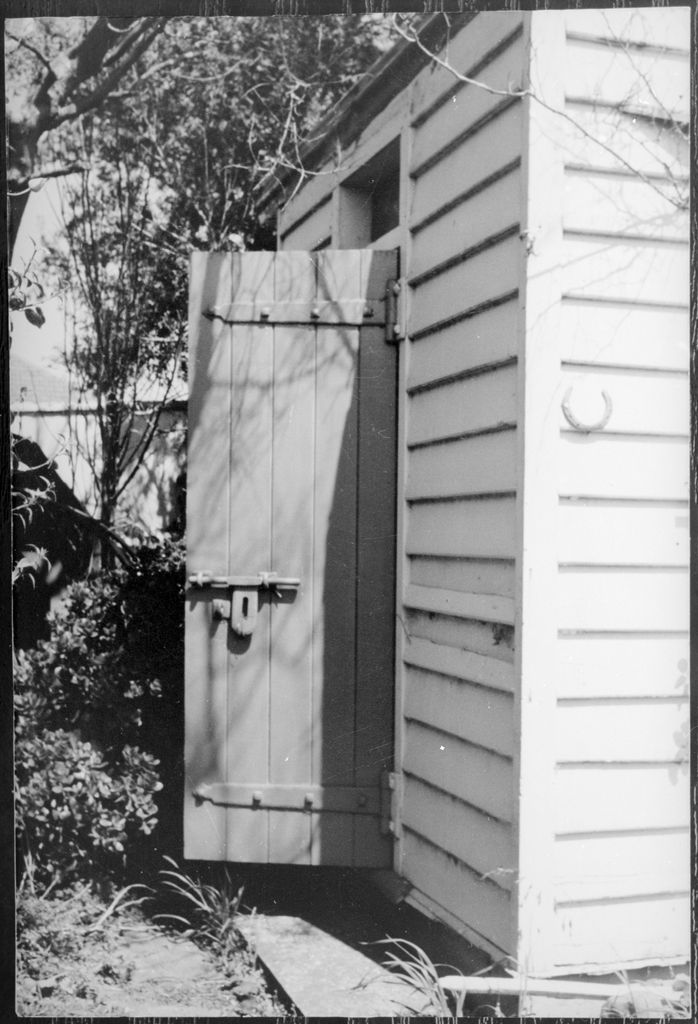 This one room cell was an outbuilding at the third Ashhurst Police Station, which located on Guildford Street from 1922 until 1944. The cell was removed to the back yard of Constable Jock Watt's property in Storford Street in 1960 and used as a shed. It was photographed by Ray Carter when researching his book 'Beyond the Call of Duty': a History of the Palmerston North Police District (1988).