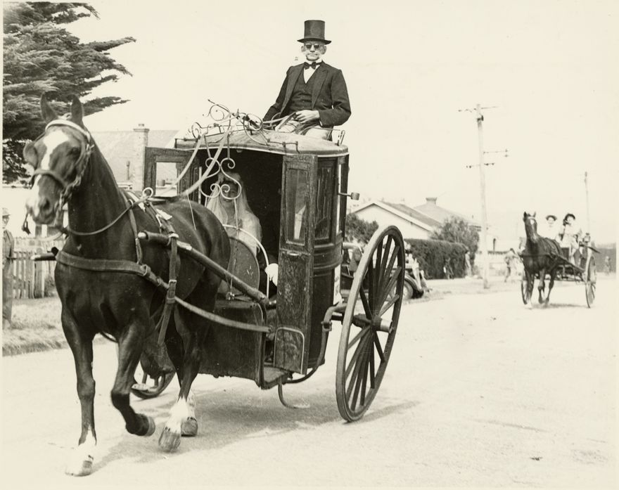 There was a week of events to celebrate Palmerston North being granted Borough status in 1877. On Wednesday a 'Cavalcade of Transport Through the Ages' paraded around The Square. This Hansom cab, complete with top-hatted driver and bridal couple, was among the historic horse-drawn vehicles in the parade. The cab was owned by the Hawera Borough.