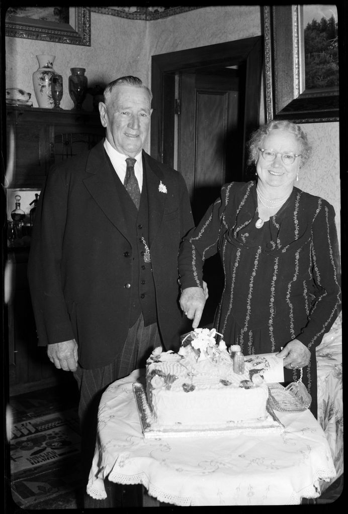 This image was taken for a story that ran in The Manawatu Evening Standard on 28 November 1956: "Mr. and Mrs. G. Greer, of Tiritea, who are celebrating their 50th wedding anniversary today. They are seen here cutting the special cake made for the occaision by their eldest daughter, Mrs. J. Kennard, and iced by a sister-in-law, Mrs. M. Lynch."