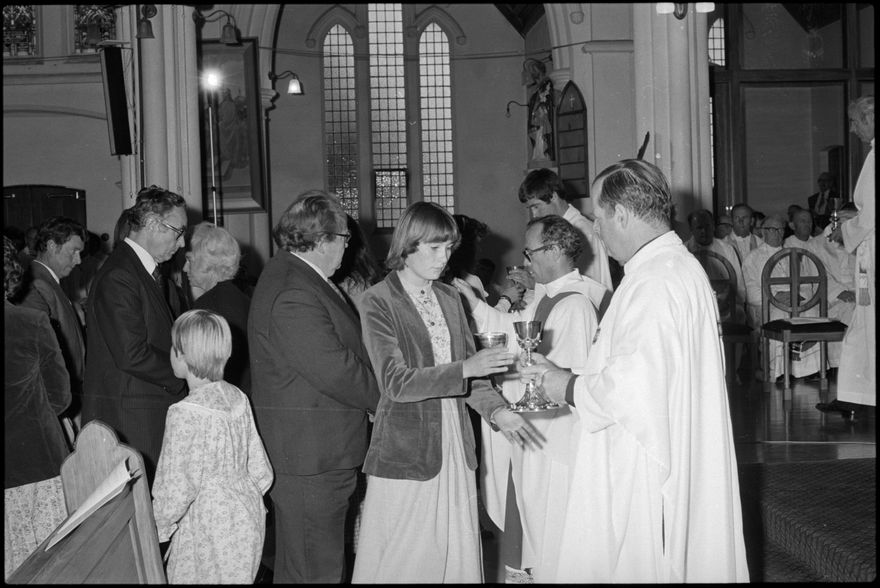 This image was taken by the Evening Standard on the 23rd of April 1980 and was published on the 26th. It depicts a moment from the ordination of Father Peter Cullinane as a Catholic Bishop.