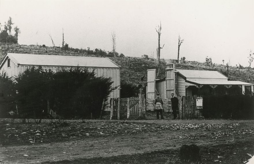 Michael Enright, farmer and Postmaster, and son outside the Royal Mile Stables and home. The house (on right) was built in 1896, and a postal room added at front right, as seen. The house was used by the Enright family until the 1930s.