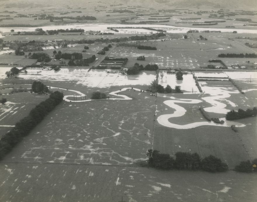 Aerial photograph shows flooding of farmland near Awapuni Racecourse and Pioneer Highway, Palmerston North. On the far side of the Manawatu River the stopbank has stopped flooding at Linton.
