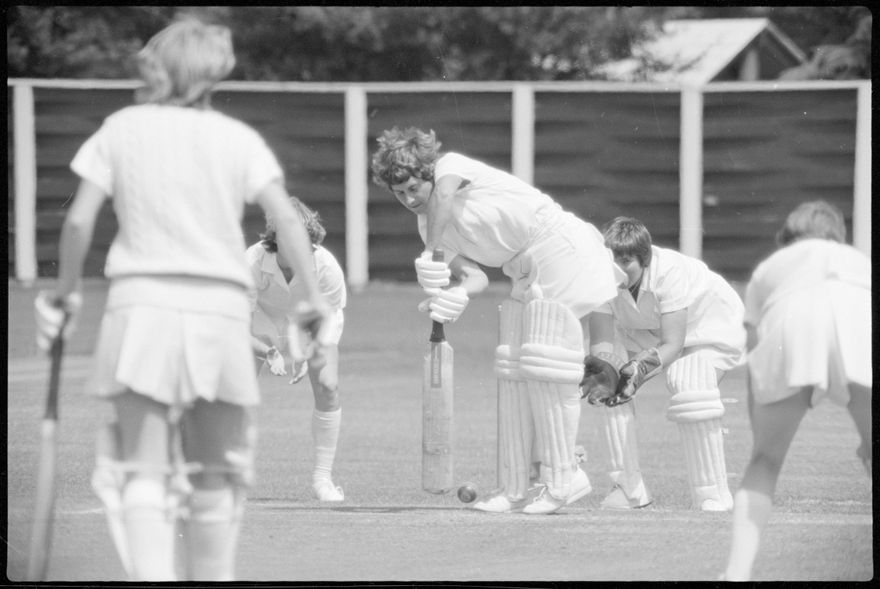 This image was taken (but not published) by the Evening Standard on either the 27th or 29th of December 1980. It depicts a moment of action from the Hallyburton Johnstone Shield 2-day match between the Auckland and Canterbury women’s cricket teams. Canterbury won by 10 wickets.
