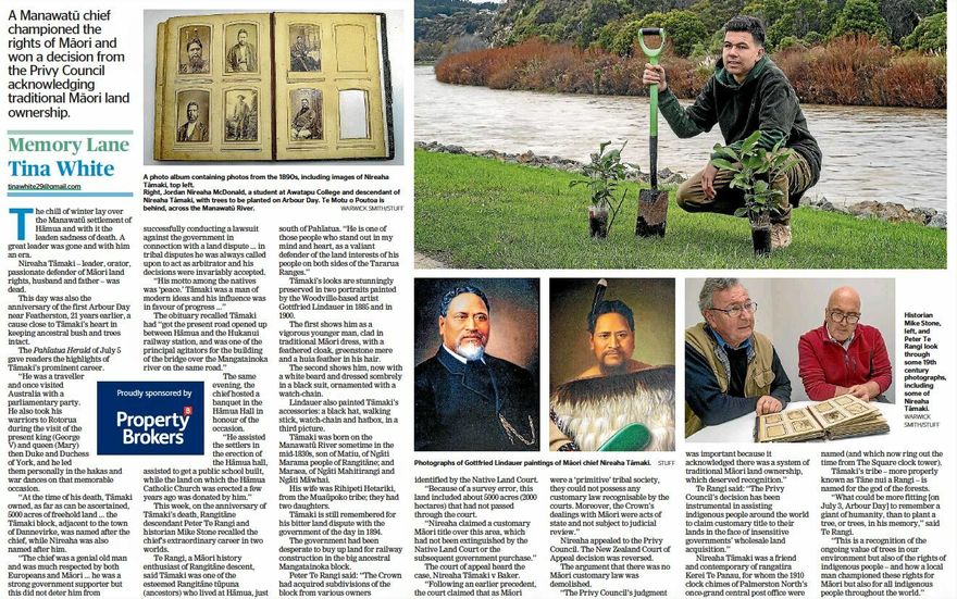 Journalist Tina White's weekly "Memory Lane" article in the Manawatū Standard. The life story of respected Manawatū chief Nireaha Tāmaki (mid-1830s - 1911), a tribal arbitrator who championed the rights of Māori and won a decision from the Privy Council acknowledging traditional Māori land ownership.