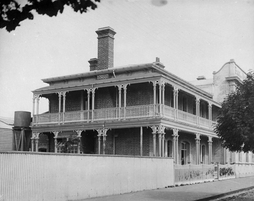 This house was the home of the Manager of the Palmerston North Bank of New Zealand , which stood on the corner of The Square and Fitzherbert Street (see the edge of BNZ at left). The building, constructed c1898, is appears to have become a boarding house after the Bank moved to the corner of The Square and Rangitikei Street in 1915. It is said to have been burnt down in a fire in the 1930s.