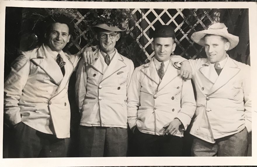 A dance band - possibly Len Spelman’s Ambassadors - posing for what might be a promotional photograph: L-R: Hock Prime (saxophone), Len Spelman (piano), Alan Sundborn (guitar), Walter Rumsey (drums)