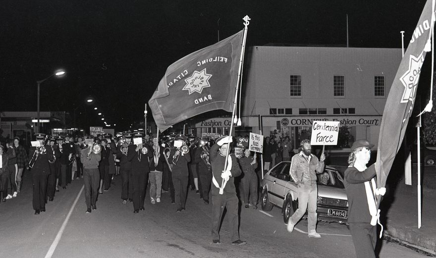 “Feilding Gay Task Force members flank the Salvation Army Centennial march through the town last night. About 15 to 20 task force members walked silently beside the march, letting their banners speak for them in their protest against the Salvation Army’s opposition to the Homosexual Law Reform Bill. Spokesman for the group Peter Pawson said the protesters were asked to stop, but the protest remained peaceful and non-violent.”